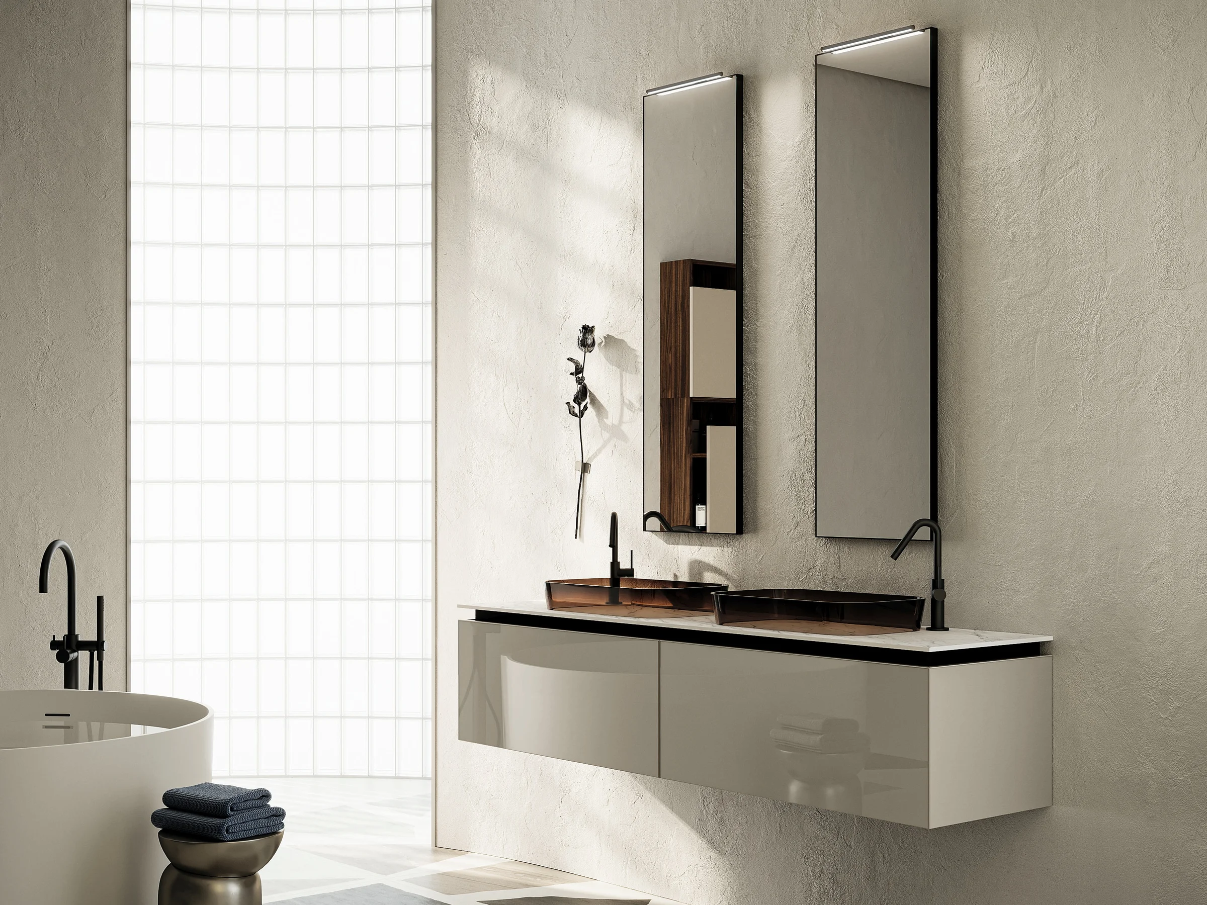 Doppelwaschtisch ALTO 01 mit heller Marmorplatte und zwei bernsteinfarbenen Auflagebecken auf grauem Unterschrank