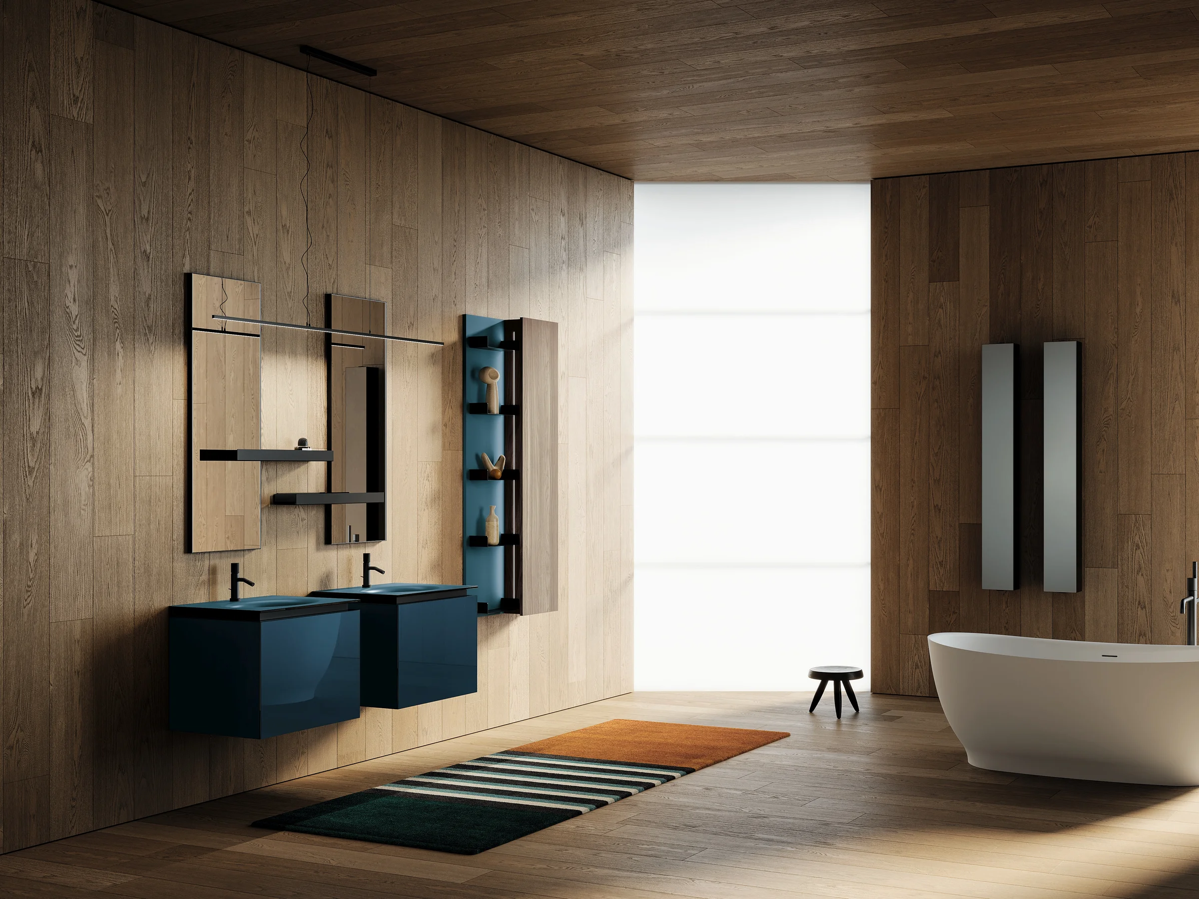 Doppelwaschtisch ALTO 09 mit zwei getrennten Modulen in tiefem Blaugrün und mattem Glaswaschtisch