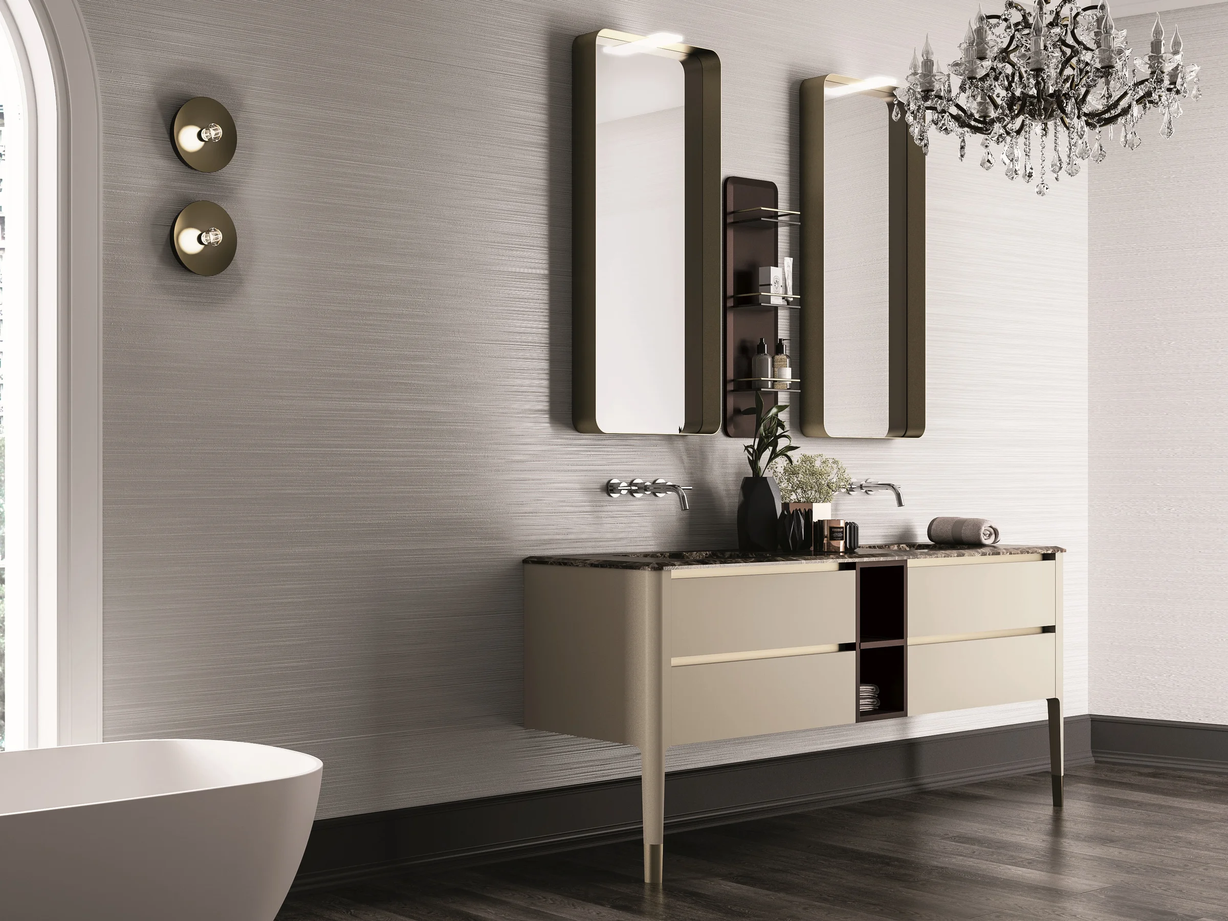 Bodenstehender Doppelwaschtisch ART 10 in Champagnerton mit brauner Marmorplatte und offenem Mittelfach