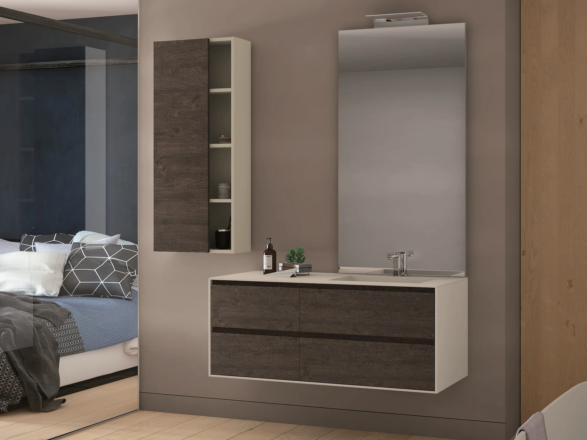 Waschtisch EDGE-LeCornici 07 mit heller Platte und dunklen Holzfronten in hellem Lackrahmen