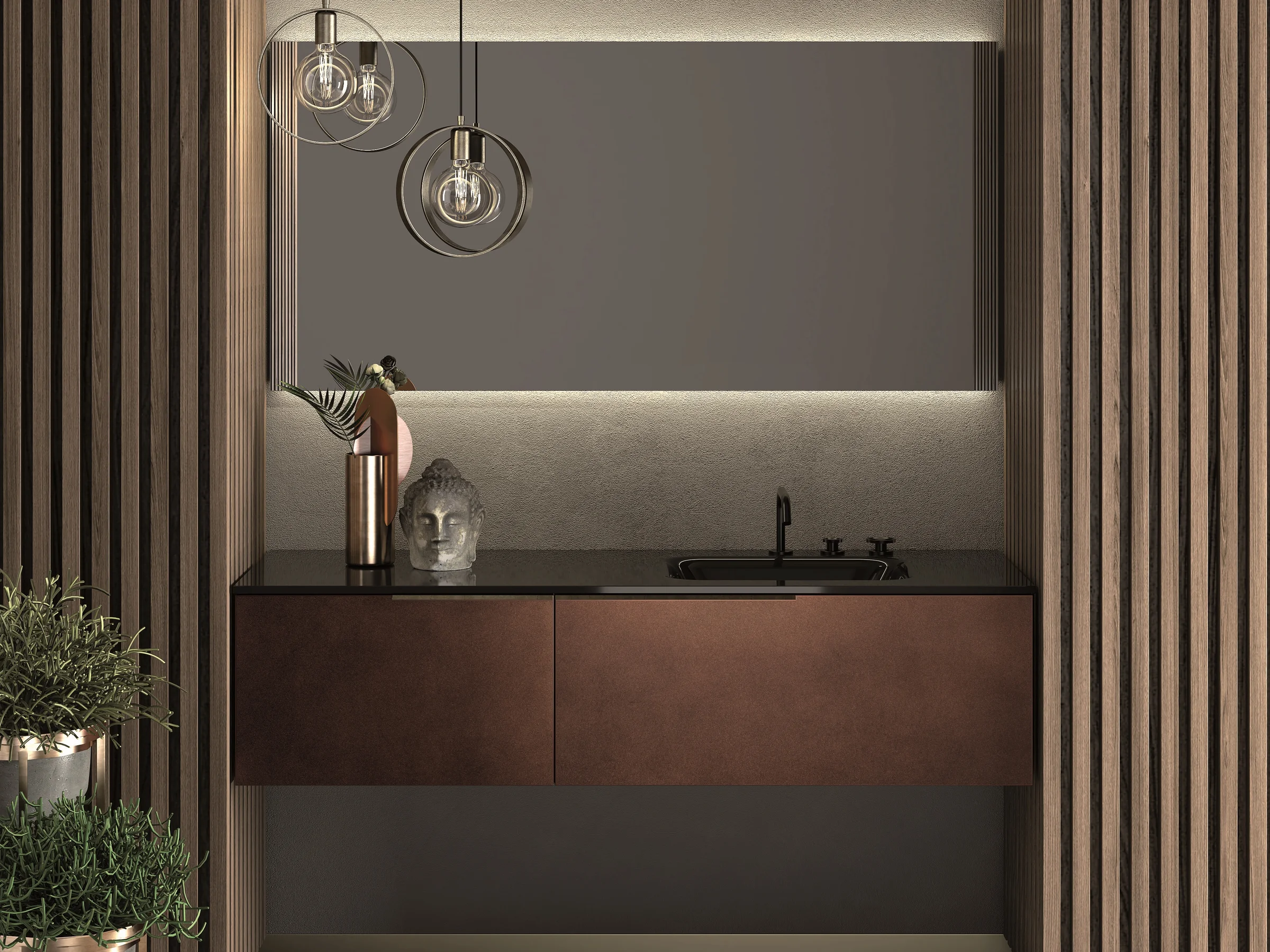Waschtisch OLA NW2_01/B mit tiefschwarzer Glasplatte und kupferfarbenen Metallic-Fronten