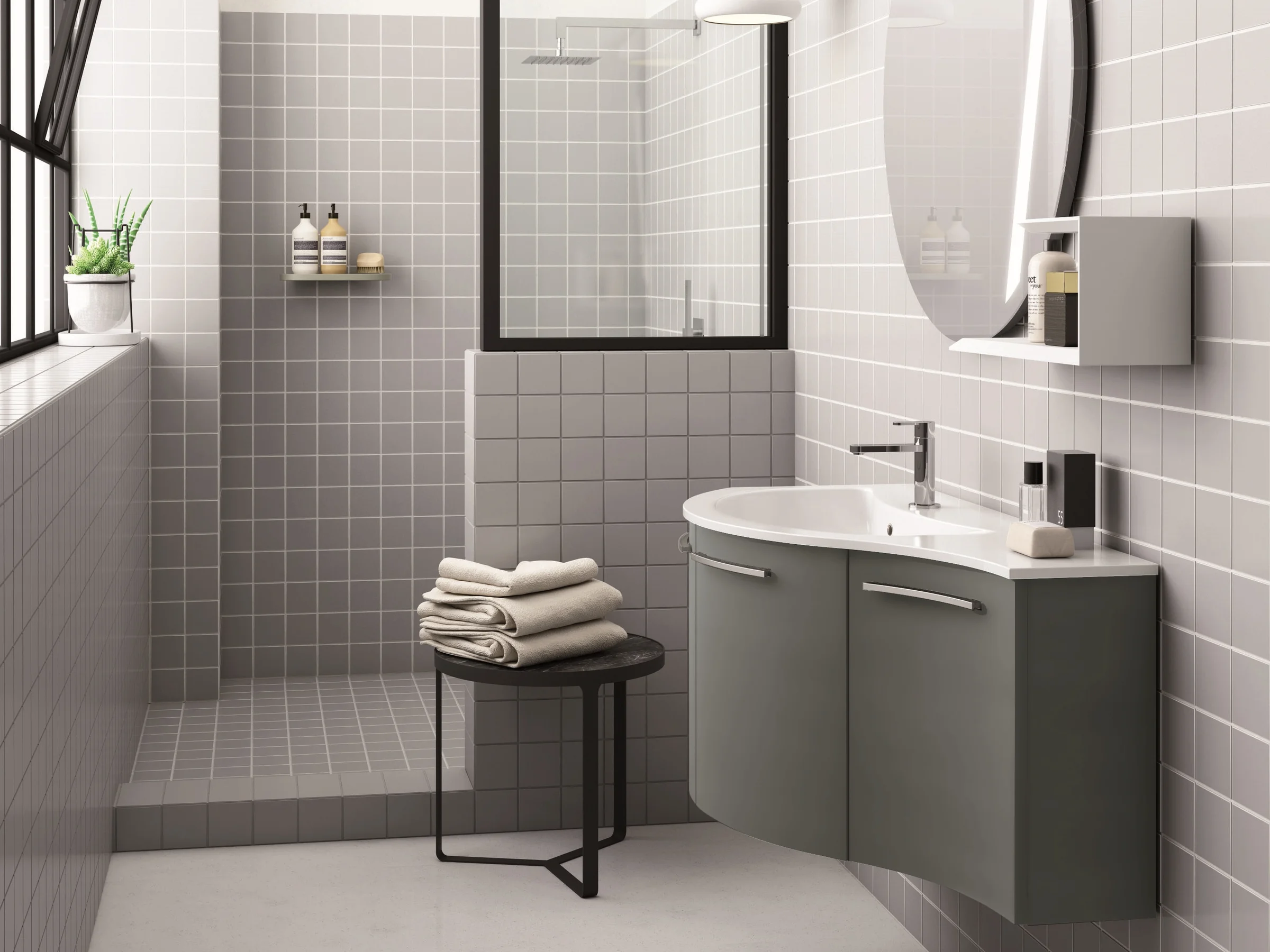 Waschtisch OLA P-503/B mit konvex gewölbten Fronten in Mausgrau und organisch geschwungenem weißen Becken