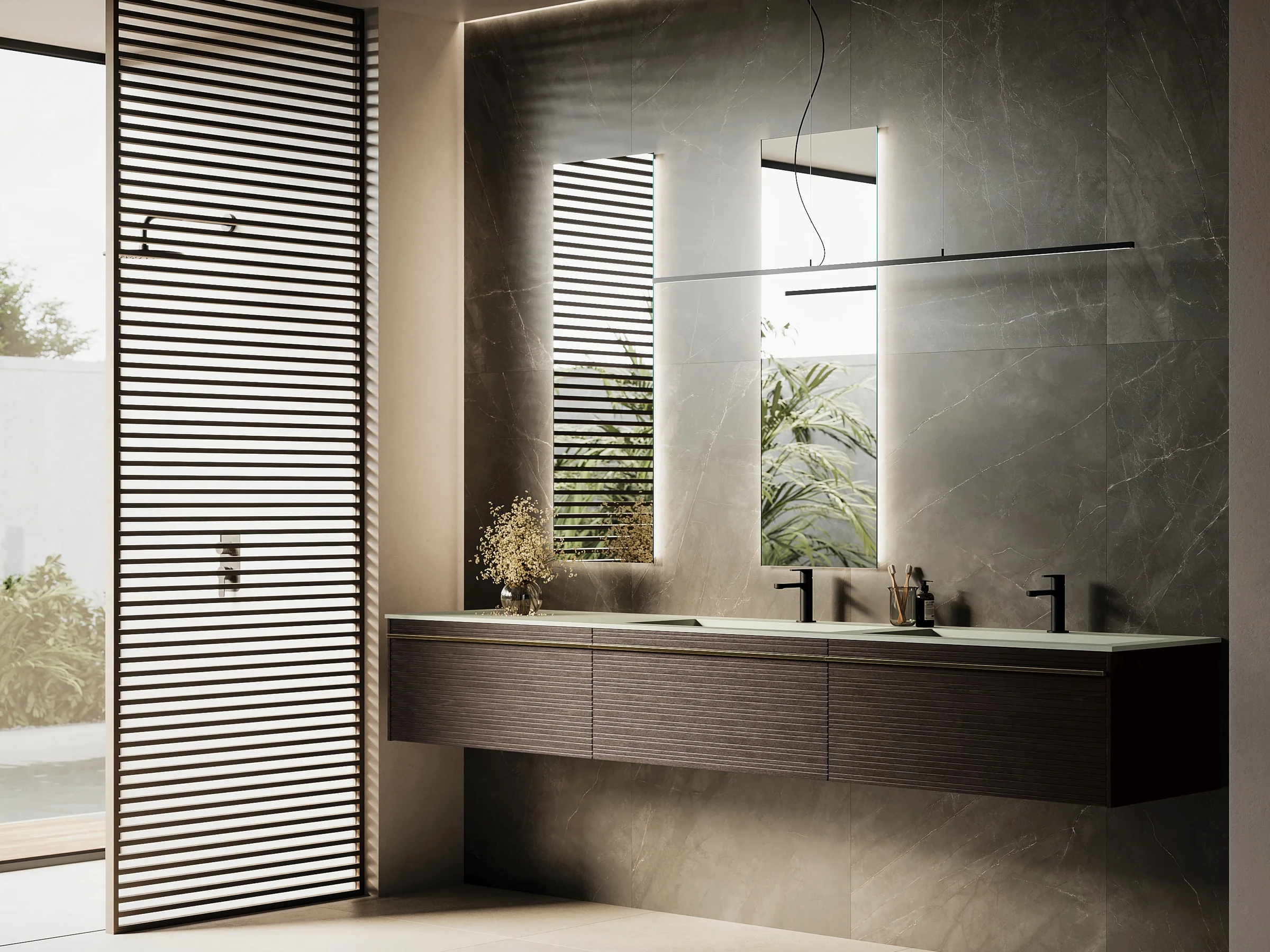 Doppelwaschtisch REVERSO 05 mit heller Mineraltek-Platte und dunklen gerillten Holzfronten