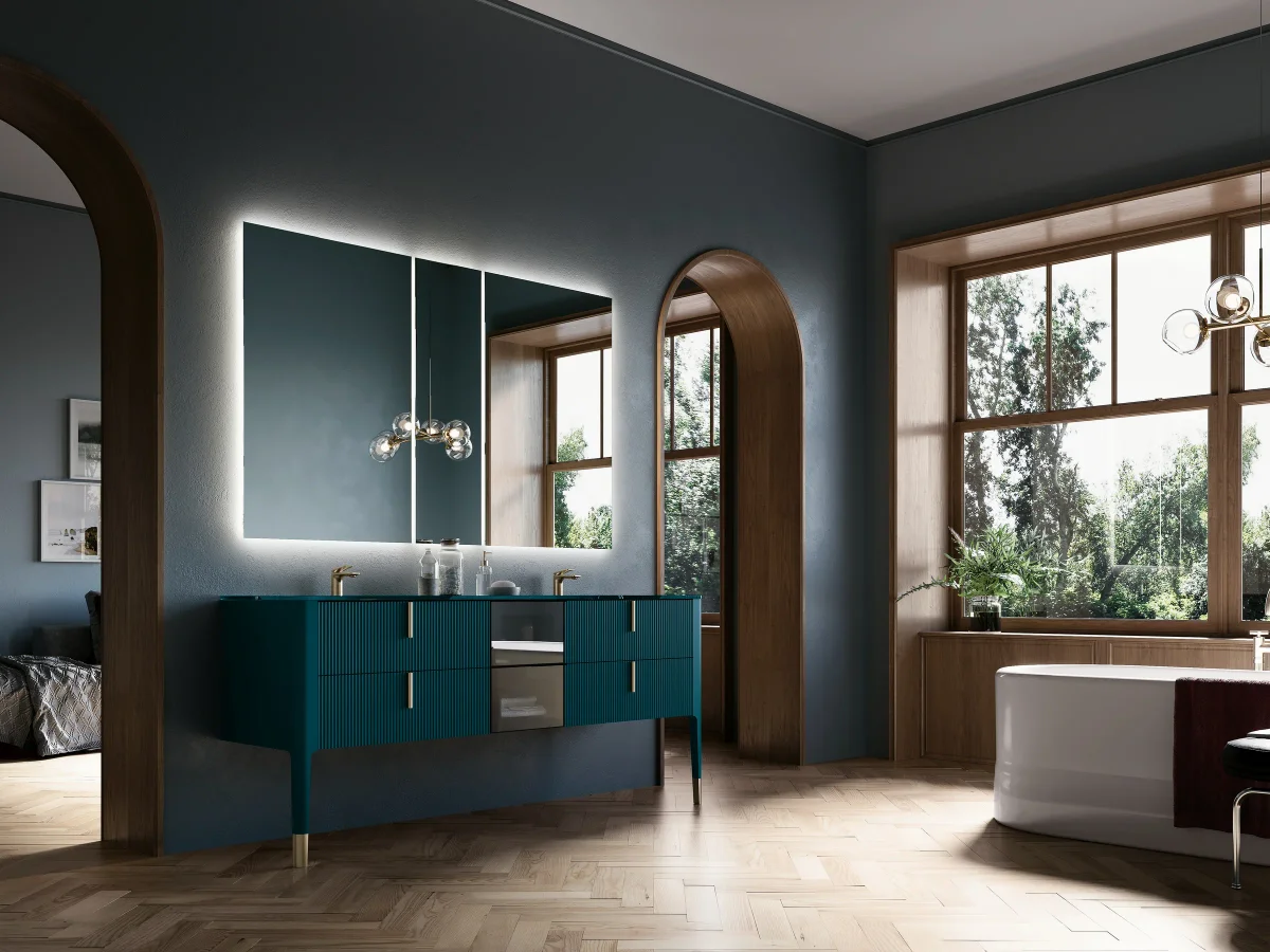 Barrierefreie Beschreibung dieser Waschtisch-/Badmöbel-Kombination: A — Waschtisch Die Waschtischplatte und die beiden Becken sind in sattem, glänzendem Teal gehalten — ein tiefes, leuchtendes Blaugrün mit hochglänzender Oberfläche. Die Becken sind rechteckig mit gerundeten Ecken, fugenlos in die Platte eingelassen, die Innenflächen im selben intensiven Teal. Platte, Becken und Möbelfront bilden eine durchgehende Farbeinheit — alles im selben kräftigen Ton. Die Armaturen sind in warmem Gold gehalten — geschwungene, elegante Ausläufe, die sich leuchtend vom dunklen Teal abheben. Zwischen den Becken stehen Glasgefäße und Pflegeprodukte. B — Möbel Der breite Unterschrank steht auf schlanken, goldfarbenen Metallbeinen — bodenstehend und repräsentativ. Die Fronten zeigen feine, vertikale Rillenstruktur im selben satten Teal wie Platte und Becken — hochglänzend, mit dichtem Linienmuster. Sechs Fronten — Türen und Schubladen — mit schmalen, vertikalen Stabgriffen in Gold. In der Mitte ein offenes Fach in dunklem Ton. Die Detailaufnahme zeigt die präzisen, glänzenden Rillen und die Goldgriffe im Seitenlicht. Über dem Waschtisch ein dreiteiliger Spiegelschrank mit umlaufendem LED-Hintergrundlicht. C — Ambiente Die Wände sind in gedämpftem Dunkelblau gestrichen — ein tiefes, ruhiges Blaugrau. Links und rechts große Rundbogen-Durchgänge mit Holzvertäfelung in warmer Eiche, die in angrenzende Räume führen — ein Schlafbereich und ein Wohnbereich mit hellem Sofa. Rechts ein großer Rundbogen-Standspiegel mit Goldrahmen. Bodentiefe Sprossenfenster mit Blick ins Grüne. Der Boden besteht aus hellem Eichenparkett in Fischgrät-Verlegung. Rechts eine freistehende weiße Badewanne. Eine Pendelleuchte mit mehreren Glaskugeln an Messingarmen. Farbwelt: sattes Teal, Gold, Dunkelblau, warme Eiche, Fischgrätparkett — kräftig, repräsentativ und farbenfroh. D — Gesamteindruck Ein opulenter, farbstarker Raum mit Grandhotel-Anmutung. Das durchgehende Teal mit Goldakzenten erzeugt eine selbstbewusste, fast dekorative Präsenz. Die Rundbögen, das Fischgrätparkett und die Glasleuchte geben dem Raum eine klassische Großzügigkeit. Für jemanden, der Farbe, Glanz und repräsentative Geste im Bad vereinen möchte — kein Understatement, sondern bewusster Auftritt.