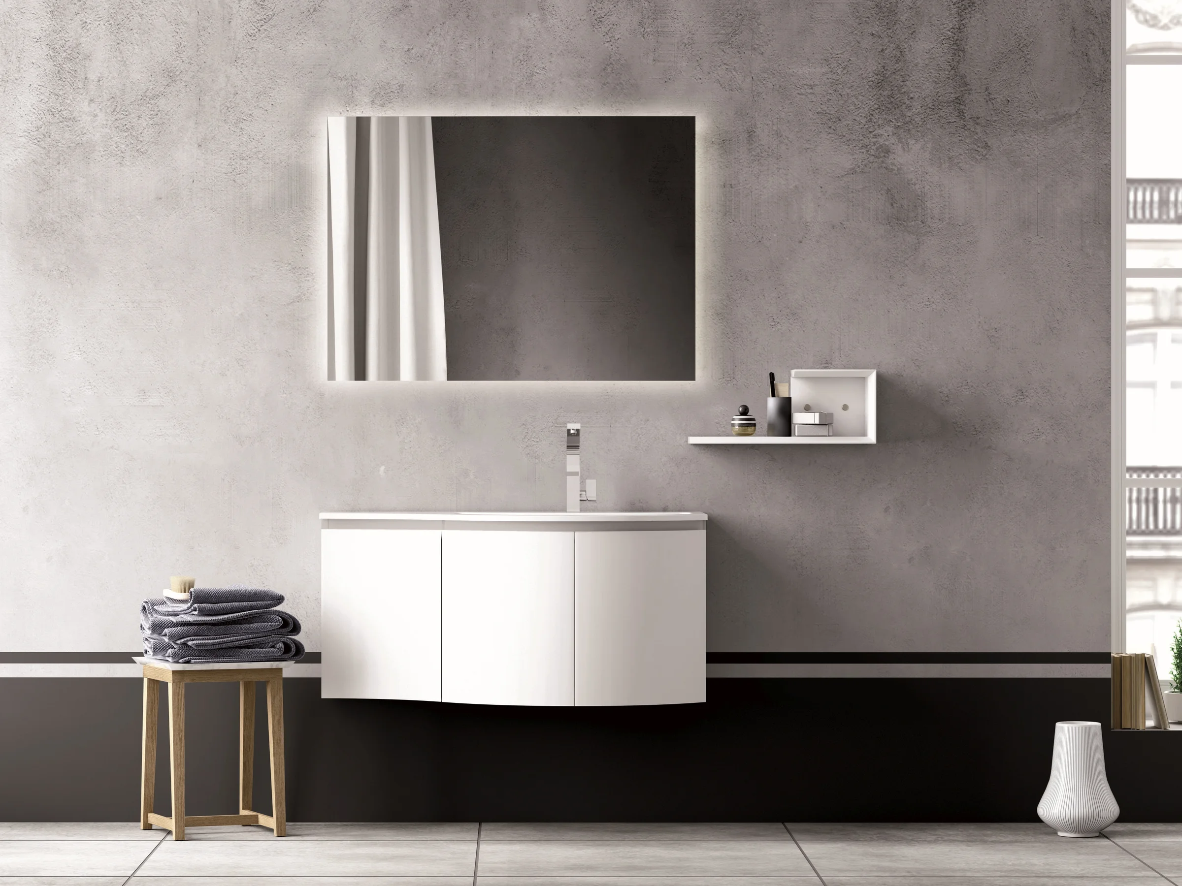 Waschtisch YOUNG F-511/B mit konvex gewölbten weißen Fronten und organisch geschwungenem Becken