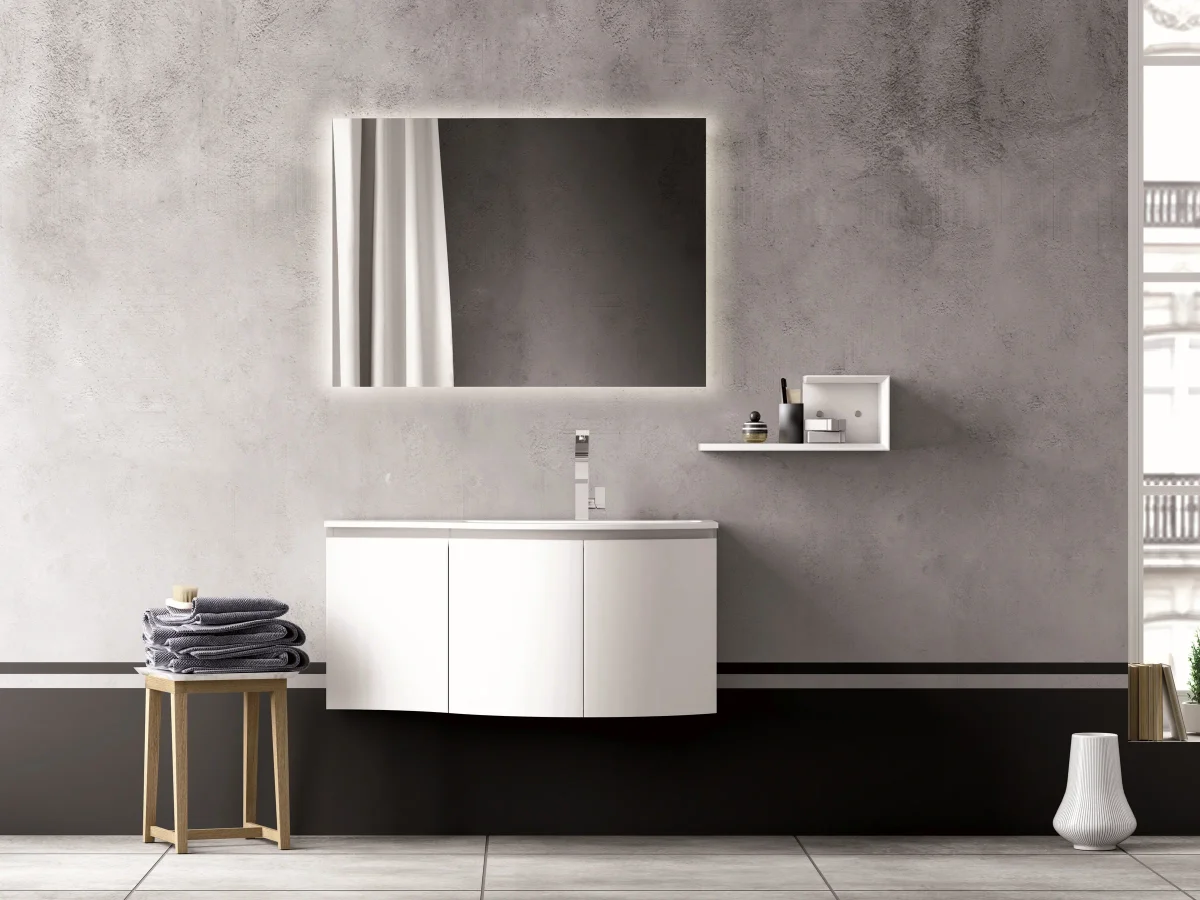 Barrierefreie Beschreibung dieser Waschtisch-/Badmöbel-Kombination: A — Waschtisch Die Waschtischplatte ist weiß, glänzend und organisch geschwungen — die Vorderkante folgt einer konvexen Rundung. Das Becken ist als große, halbrunde Mulde in die Platte eingeformt — fugenlos, mit weich abfallenden Innenflächen. Die Draufsicht zeigt die wellenförmige Kontur der Platte, die der geschwungenen Möbelfront folgt. Die Standarmatur ist in poliertem Chrom gehalten — ein hoher, geschwungener Auslauf mit kantiger Formgebung. Platte und Möbel verschmelzen farblich — durchgehend Weiß. B — Möbel Der schwebende Unterschrank hat eine geschwungene, konvex gewölbte Front mit glatten Flächen in mattem Weiß. Drei Türfronten nebeneinander, grifflos über schmale Schattenfugen geöffnet. Die Rundung gibt dem Möbel eine weiche, organische Silhouette. Über dem Waschtisch ein querformatiger Spiegel mit LED-Hintergrundbeleuchtung und abgerundeten Ecken. Rechts daneben eine kleine, offene Wandablage in Weiß mit Pflegeprodukten. C — Ambiente Die Wand ist zweigeteilt: oben ein grober, wolkiger Putz in kühlem Grau mit sichtbarer Textur, unten eine glatte, schwarze Sockelzone. Der Boden besteht aus großformatigen, hellen Fliesen in Betonoptik. Links steht ein kleiner Beistelltisch in hellem Holz mit gestapelten, dunklen Handtüchern. Rechts ein Fenster mit hellen Vorhängen und eine weiße, kegelförmige Bodenvase. Das Licht fällt seitlich natürlich ein. Farbwelt: Weiß, kühles Grau, Schwarz, helle Betonfliesen — monochrom, klar und reduziert. D — Gesamteindruck Ein monochromer, ruhiger Raum, in dem die geschwungene Form des Möbels das einzige auffällige Gestaltungselement ist. Die Rundung bringt Weichheit in die strenge Schwarz-Weiß-Palette. Die Szene wirkt nach reduziertem, durchgestaltetem Stadtraum — für jemanden, der klare Formen und monochromatische Ruhe dem Farbexperiment vorzieht.