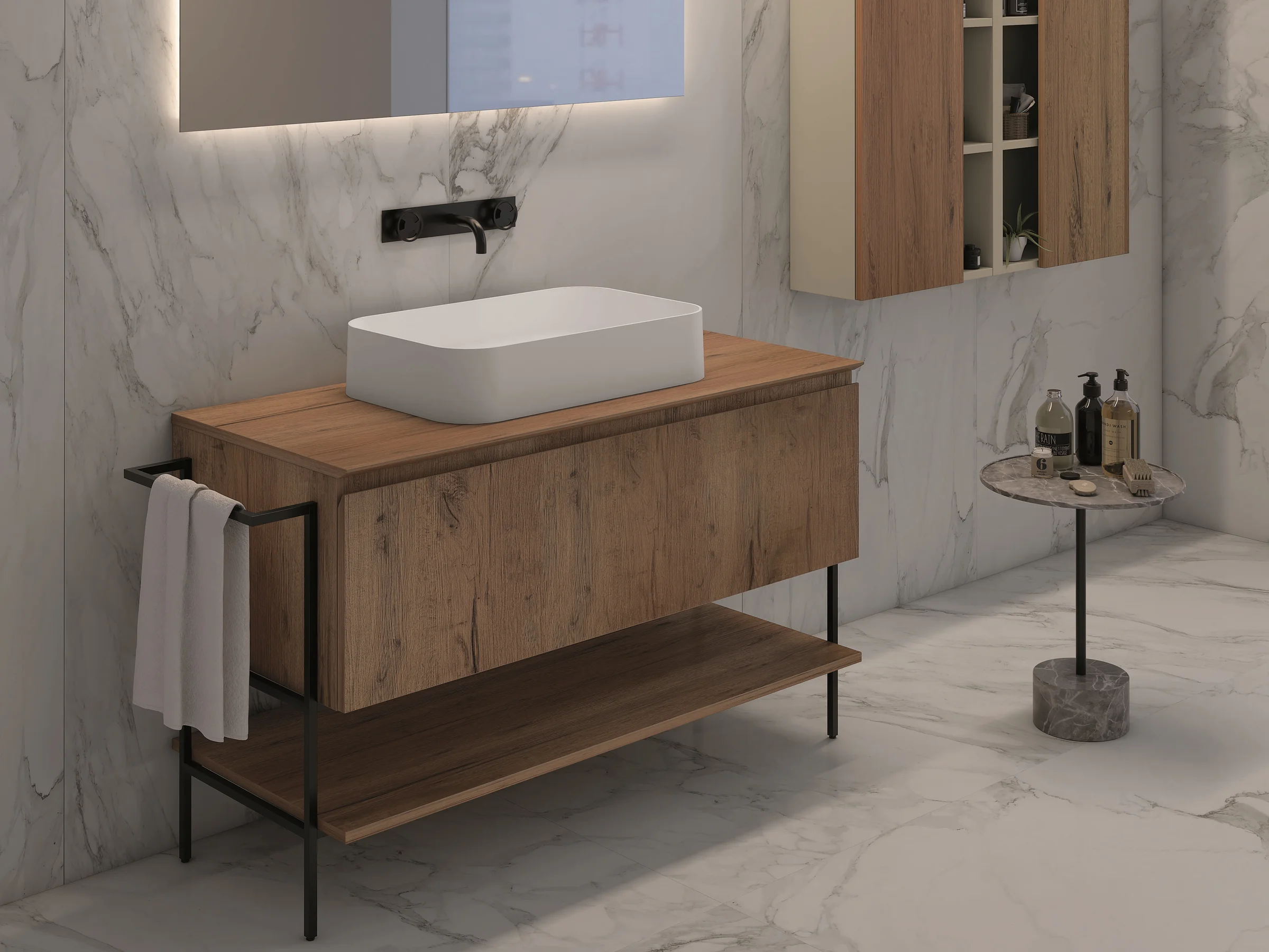 Waschtisch YOUNG NW2_12 mit rustikaler Eichenholzplatte und weißem Auflagebecken neben grauem Begleitschrank