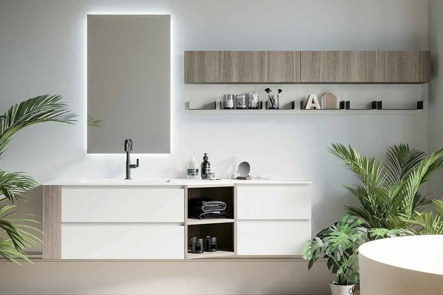 In vielen Badezimmern gibt es Nischen, die oft ungenutzt bleiben, weil standardisierte Waschtische nicht passen. Wir fertigen Ihren Waschtisch exakt auf die Nischenbreite — wandbündig, ohne Spalt, ohne Silikonfuge. Ein Beispiel: Eine Nische mit 177 cm Breite. Der rechte Unterschrank wird auf 52 cm Sonderbreite angepasst. Der Waschtisch mit integriertem Becken wächst automatisch mit. Die Beckenposition stimmen wir auf Ihre Wasseranschlüsse ab — mittig, links oder rechts versetzt, ohne Aufpreis. Zusätzlich bieten wir Spiegel, die speziell für Ihre Nische gefertigt werden. Ein maßgeschneiderter Spiegel reflektiert das Licht optimal und macht aus einer räumlichen Herausforderung ein Gestaltungselement.