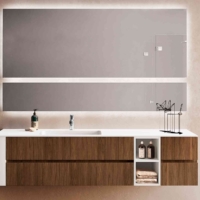 - Abgebildete Badmöbel-Oberfläche: Laminat Materic Sable Oakfield (120x) kombiniert mit Seta Bianco Bordato (132x)