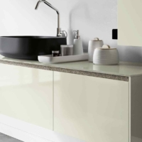- Abgebildete Badmöbel-Oberfläche: lackiert Grauweiß Hochglanz (L003G) kombiniert mit Laminat Matrix Piasentina Toreano (128x)