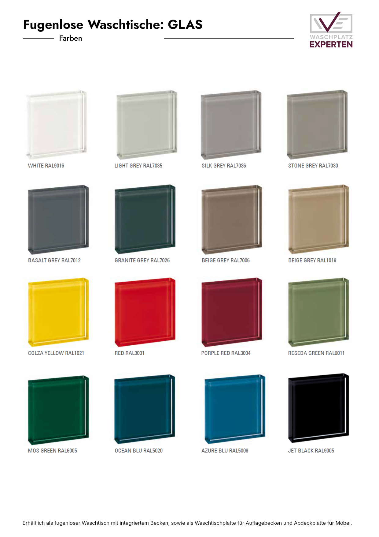 Glaswaschtische sind vor allem eines: Farbe mit Tiefe. Weil der Farbton im Material wirkt, entsteht je nach Licht ein anderer Eindruck – morgens klar und frisch, abends satter und ruhiger. Genau dafür ist die Palette da: Verkehrsweiß für ein cleanes, helles Bad, Ozeanblau für spürbare Tiefe, Rapsgelb als Akzent und Tiefschwarz für ein konsequentes Statement. So legen Sie mit der Farbe die Richtung fest – dezent, warm oder kontraststark – und der Rest des Bades kann sauber darauf aufbauen.